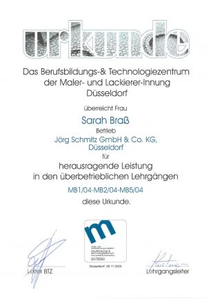 ... Leistung einer unserer Auszubildenden. Sarah Braß, Auszubildende bei Jörg Schmitz, wurde für herausragende Leistungen in den überbetrieblichen Lehrgängen ausgezeichnet.