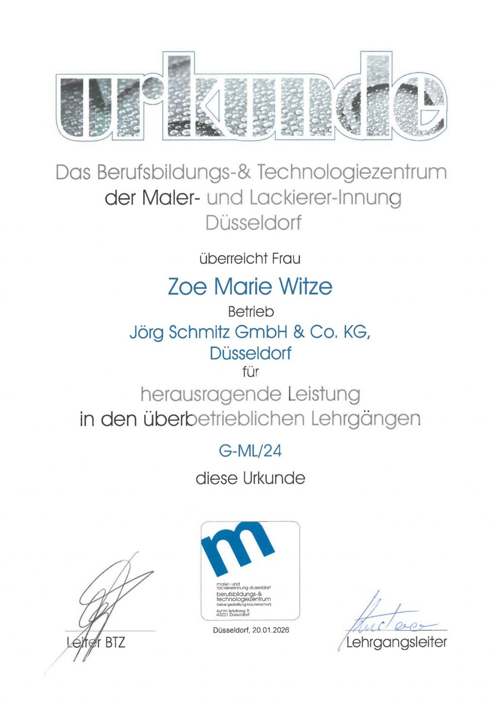... unserer Auszubildenden. Zoe Marie Witze wurde am 20.01.2026 für herausragende Leistungen ausgezeichnet.